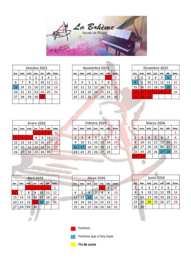 En caso de festivo, si es la cuarta clase del mes, sí hay clase; si es la quinta clase del mes, no hay clase. De esta manera, obtenemos un mínimo de 4 clases al mes, salvo en Navidad y en Semana Santa (en esos meses se darán 3 clases).